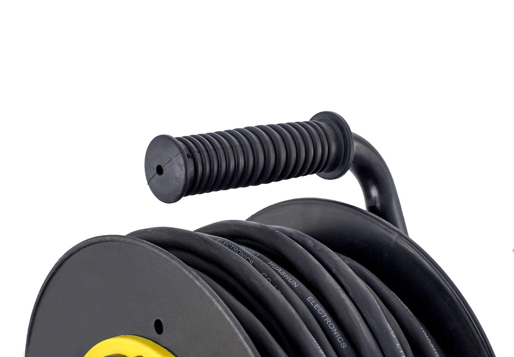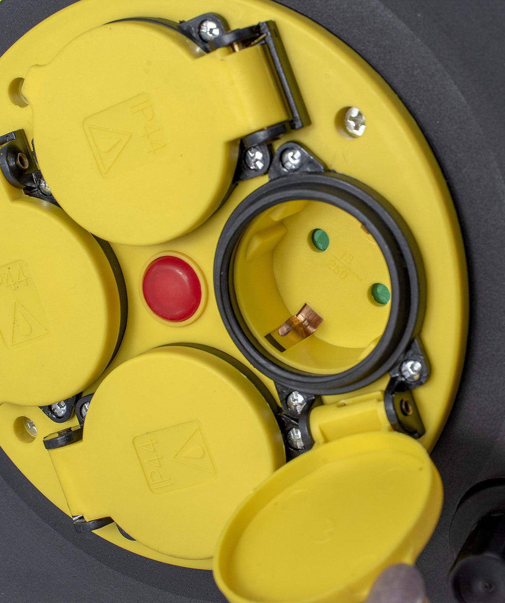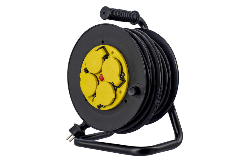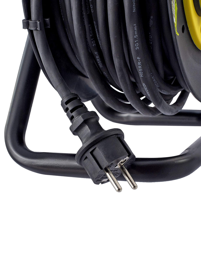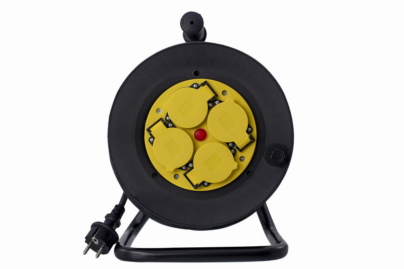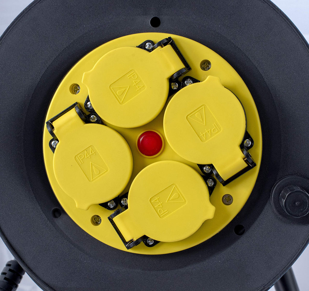Kabeltrommel mit 25m Kabellänge H05RR-F; 3G1,5 von -30°С bis +60°С 4 Schutzkontakt-Steckdosen, Spritzwassergeschützt, mit Selbstschließenden DeckelnKabeltrommel mit Überhitzungsschutz, Kontroll-Leuchte bei Überhitzung und ÜberlastungCE Mar