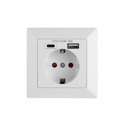 Einzelsteckdose 2P + Z mit Schuko-Erdung und zusätzlichen USB-Ladeanschlüssen (A + C). Nach dem Anschließen des entsprechenden USB-Kabels (nicht im Lieferumfang enthalten) können Sie die meisten auf dem Markt erhältlichen Telefone, Tablets und Mobilgeräte aufladen, Die Steckdose besteht aus ästhetischem Kunststoff und hat eine weiße glänzende Oberfläche . Installation in einer Standard-60-mm-Box.